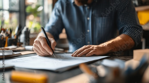 A close-up of a veteran business owner managing operations in a workshop or office, with a focus on efficiency and discipline