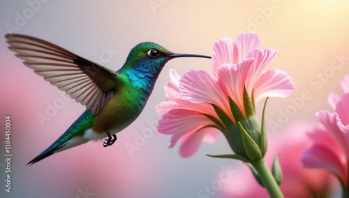 A close-up of a vibrant hummingbird hovering near a blooming flower, iridescent feathers shimmering, soft pastel background