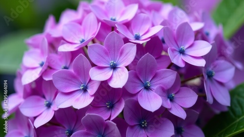 A close-up of a vibrant hydrangea purple flower cluster with delicate petals and blue centers