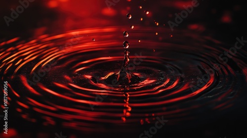 A close-up of a water droplet creating ripples in a dark, red-tinted environment.