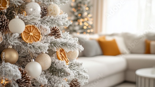 A close-up of a white Christmas tree decorated with dried orange slices, dry berries, cones, pampas grass, paper ornaments, and paper honeycombs in front of the sofa