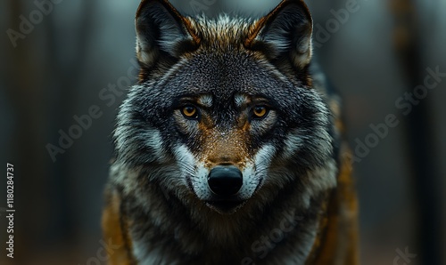 A close-up of a wolf with intense eyes in a misty forest setting.