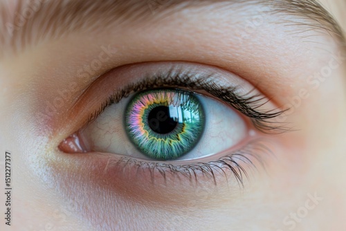 A close-up of a womans eye showing a mesmerizing rainbow iris, with brilliant hues of pink, blue, and green radiating outward in a smooth gradient