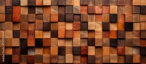 A closeup of a wooden wall constructed with brown rectangular wooden squares. The artistic flooring material property boasts beige tints and shades, serving as a unique building material