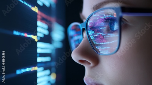 A close-up of a young programmer wearing glasses, their eyes intently focused on a computer screen filled with lines of code. The reflection in their glasses showcases the digital world they are immer
