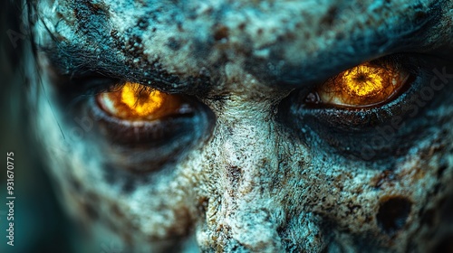 A close-up of a zombie's face with decaying skin and glowing eyes