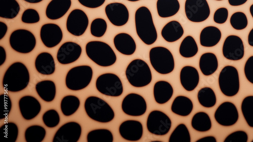 A close-up of an abstract pattern featuring irregular black spots on a tan background.