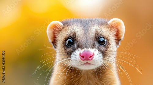 A close-up of an adorable ferret with expressive eyes and a charming expression against a blurred golden background.