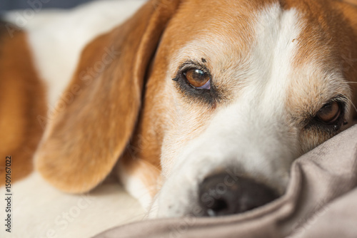 A CloseUp of an Adorable Resting Beagle Dog that has Naturally Expressive and Kind Eyes Observing Its Surroundings