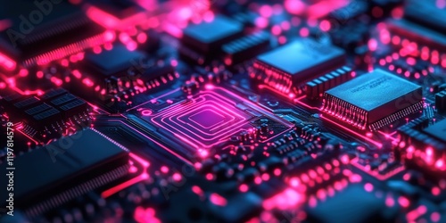 A close-up of an advanced circuit board with glowing neon lights, representing the high-tech nature and fast-paced world of data technology.