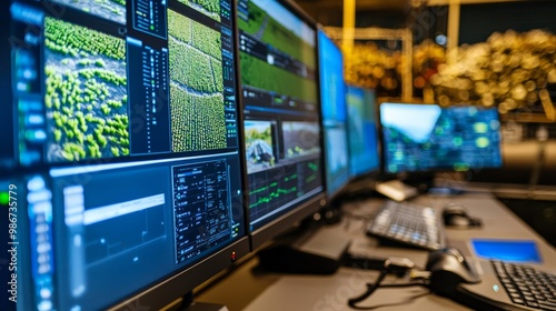 A close-up of an advanced irrigation control room, with monitors displaying real-time data for a large-scale farm