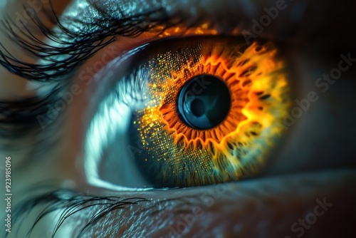 A close-up of an eye featuring a fiery, vibrant iris with intricate details and glowing patterns resembling flames and light