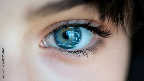 A close-up of an eye with a blue iris reflecting digital data and patterns, creating a futuristic effect. Concept Eye Close-Up, Blue Iris, Digital Data Reflection, Futuristic Aesthetics