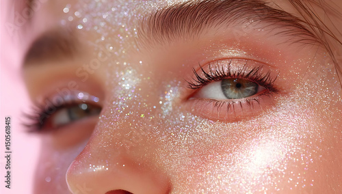 A close-up of an individual's eye adorned with shimmering glitter, capturing beauty and creativity in a dreamy, soft-focus style.