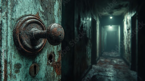 A close-up of an old, rusted door handle in a dark hallway, with shadows creeping along the walls and muted lighting adding a sense of suspense