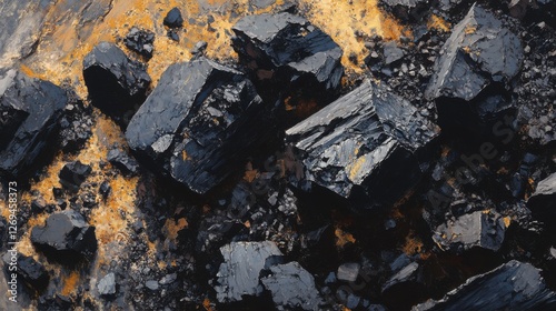 A close-up of black volcanic coal chunks scattered on a rocky surface, showing their rough texture and deep color. The volcanic ash in the background adds a rugged, natural feel to the scene.6e