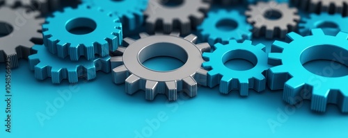 A close-up of blue and gray gears, symbolizing mechanics, engineering, and collaboration, set against a vibrant background.