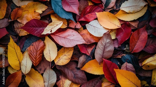 A close-up of colorful autumn leaves on the ground, with varying shades of red, orange, and yellow