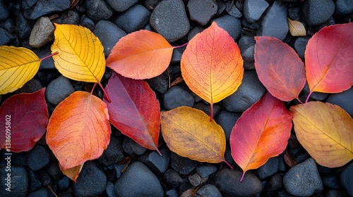A close-up of colorful autumn leaves scattered on the ground, with varying shades of orange, yellow, and red