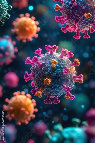 A closeup of colorful virus particles floating in a blurry background, showcasing intricate details in a medical, scientific style
