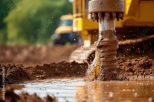 A close-up of construction equipment working in muddy terrain, spraying water, highlighting the machinery's power and the environment's impact.
