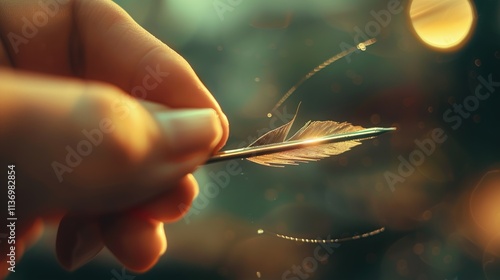 A close-up of Cupida??s hand drawing back a silver arrow, with a faint glow surrounding the arrowa??s tip, set against a soft blurred background.
