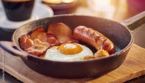 A closeup of eggs, bacon, ham, sausage and toasts. Generated image