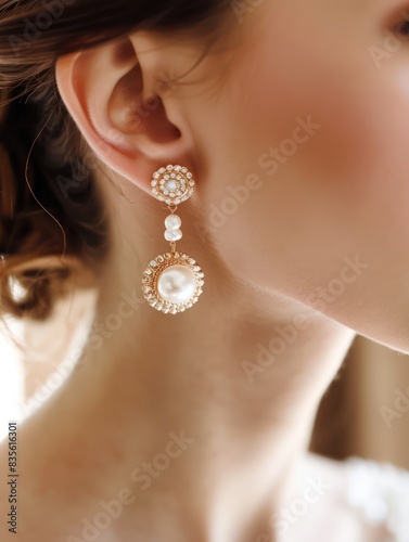 A close-up of elegant pearl earrings on a woman's ears. stock photo