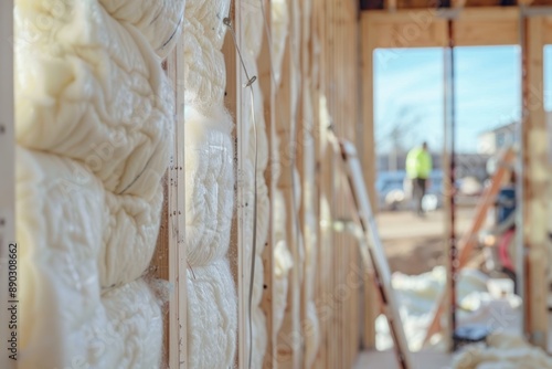 A close-up of fiberglass insulation being installed in the walls of a house. The background features a construction site