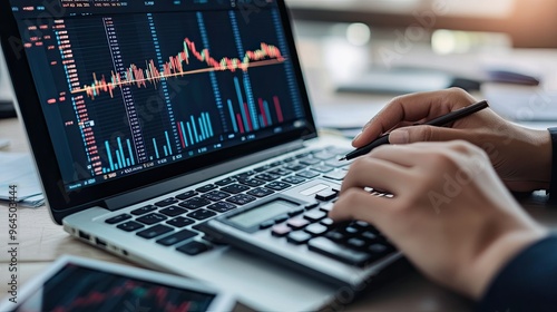 A close-up of financial charts and stock market data displayed on a laptop, with a persons hands using a calculator and making notes.
