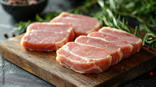 A close-up of fresh pork cuts on a wooden cutting board, highlighting the marbling and texture of the meat, with soft, natural lighting.