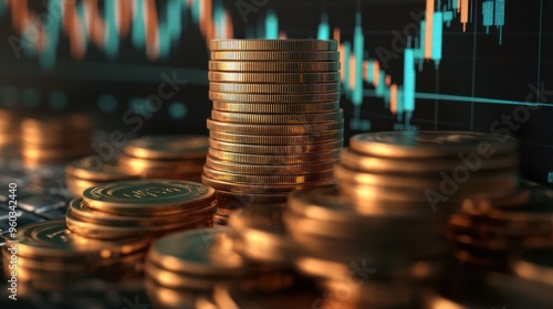 A close-up of golden coins stacked prominently with a background of financial graphs, symbolizing wealth and investment.