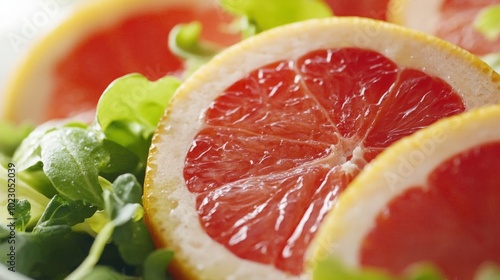 A close-up of grapefruit being added to a refreshing salad, capturing the bright color and juicy texture against a clean white backdrop