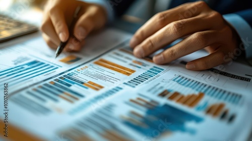 A close-up of hands analyzing financial reports with charts and graphs, showcasing data insights and business strategy.