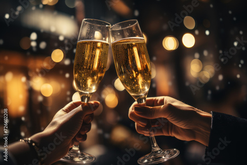 A close-up of hands clinking champagne glasses, capturing the sparkling effervescence and shared moments of joy on New Year's Day. Generative Ai.