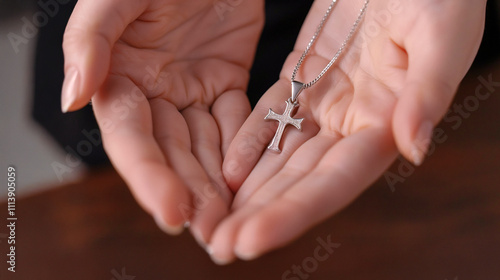 A close-up of hands gently holding a small cross pendant, with soft light highlighting the details, symbolizing faith, reflection, and hope in a quiet, peaceful atmosphere.