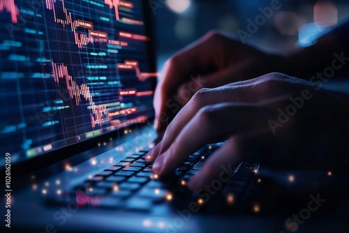 A close-up of hands typing on a laptop, illuminated by digital graphs and data visualizations against a dark background.