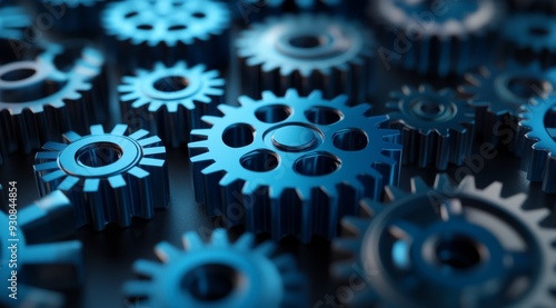A closeup of interlocking blue metal gears symbolizes teamwork and collaboration, showcasing intricate machinery in a visually stunning way that highlights the beauty of engineering and industry