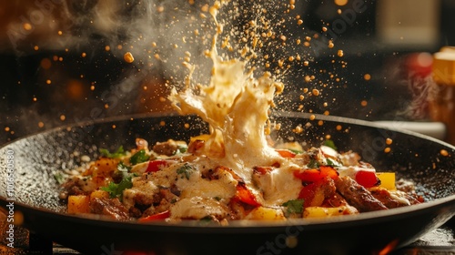 A Close-up of Melted Cheese Exploding Over a Skillet of Food