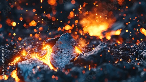 A close-up of molten lava flowing with glowing embers from a volcanic eruption. The fiery orange and red hues contrast with the dark surface, highlighting nature’s power and environmental impact.