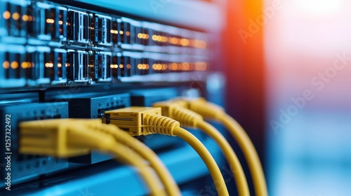 A close-up of network cables connected to a server, highlighting data connectivity and technology infrastructure.