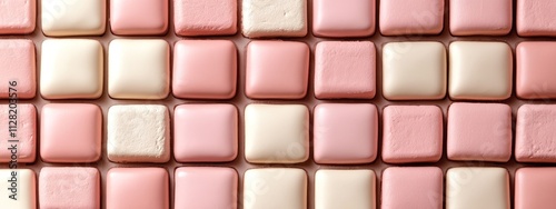 A close-up of pink and cream-colored square confections arranged in a grid pattern.