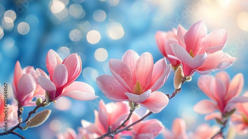 A close-up of pink magnolia flowers against a soft blue background with bokeh effects.