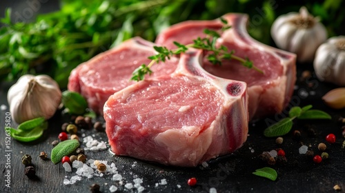 A close-up of raw pork chops on a butcher's table, surrounded by fresh herbs, garlic, and coarse salt, ready for cooking