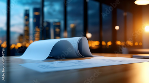 A close-up of rolled paper on a wooden desk with a city skyline in the background during twilight.