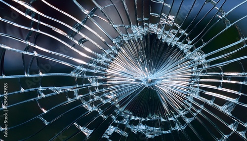 A close-up of shattered tempered glass, with jagged yet symmetrical cracks forming an intricate pattern, showcasing the sharp, fractured beauty.
