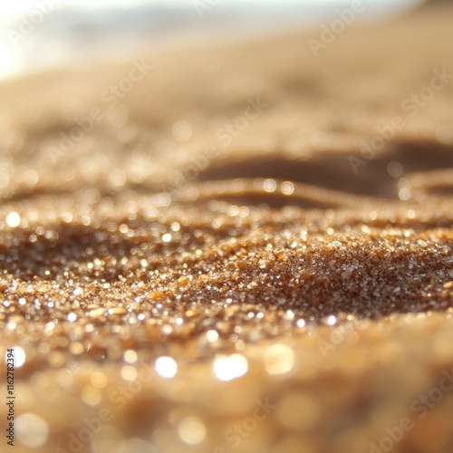A close-up of shimmering, golden sand by the shore, capturing the beauty of nature and tranquil beach vibes.