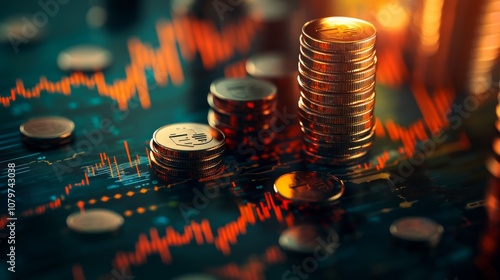 A close-up of stacked coins on a digital finance background, showcasing trends and data in investment and cryptocurrency.