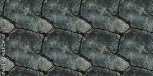 A close-up of stone with heavy weathering, with deep fissures and a blend of dark gray and greenish tones