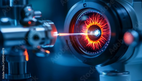 A close-up of the laser machine used for vision correction, emitting a controlled beam of light onto the cornea to correct refractive errors.